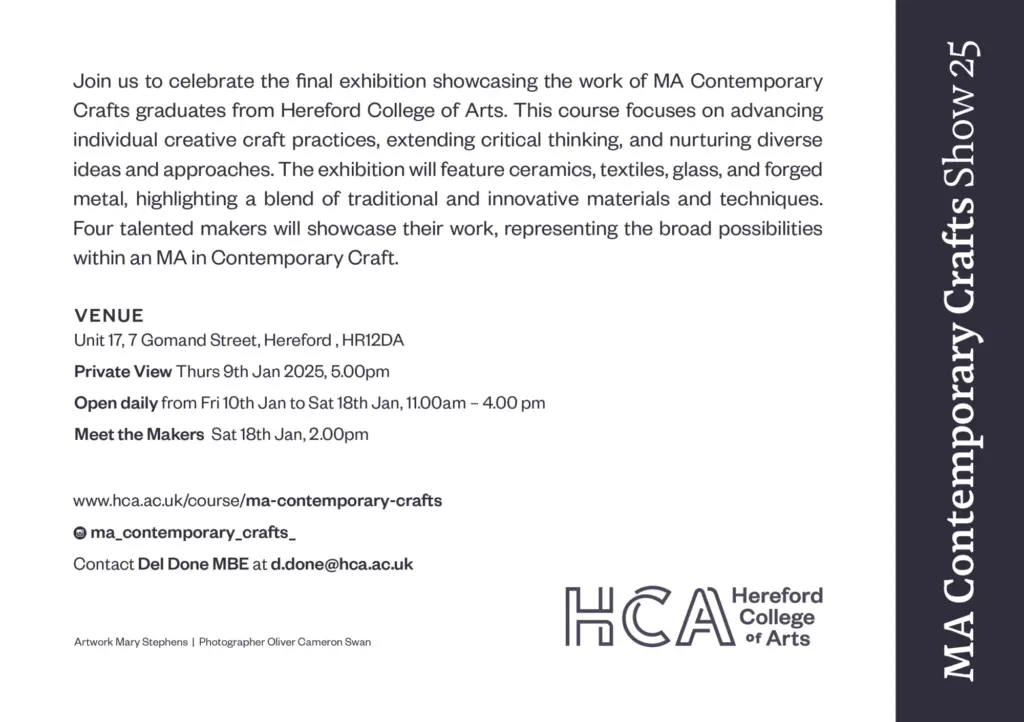 Join us to celebrate the final exhibition showcasing the work of MA Contemporary Crafts graduates from Hereford College of Arts.